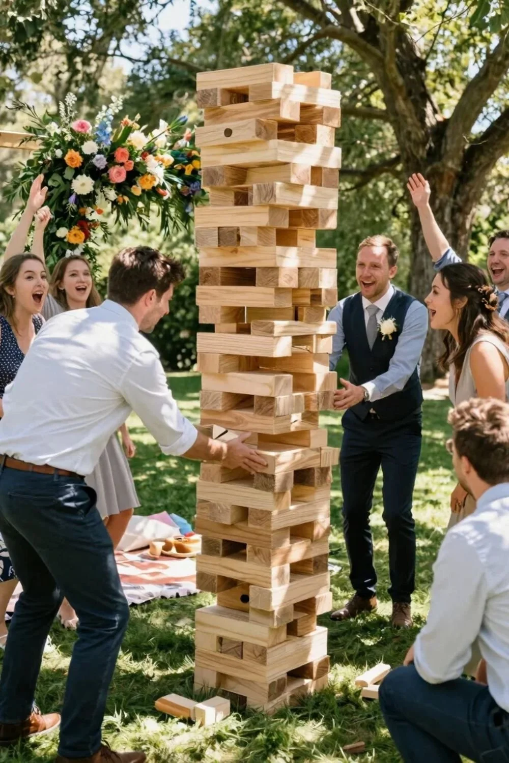 Stack it high and watch the suspense build—this oversized version of a classic game is always a crowd favorite.